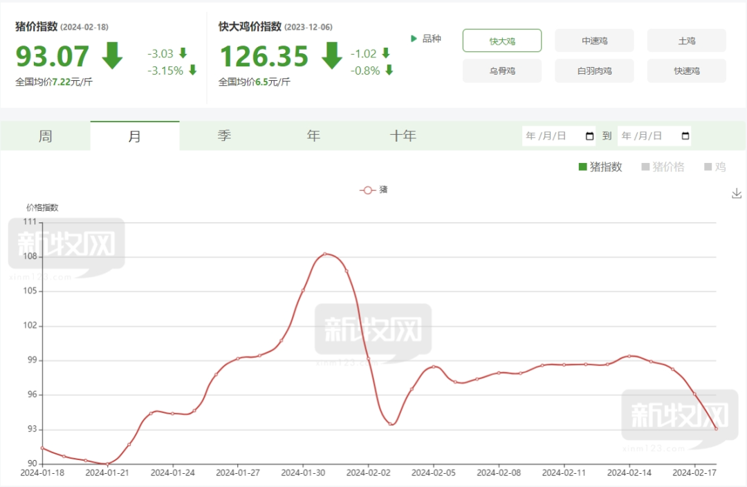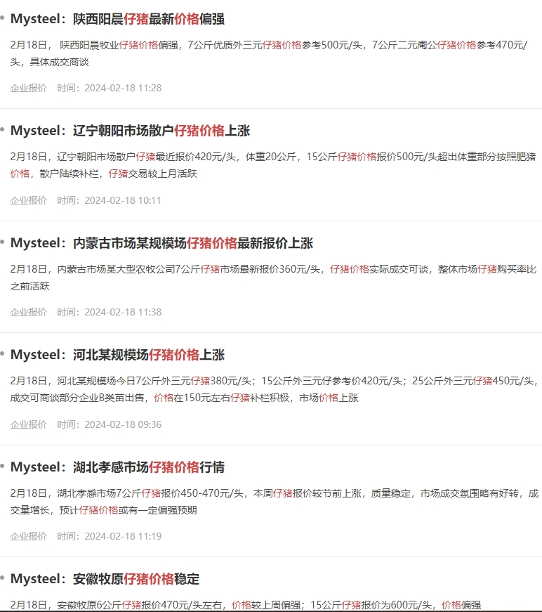 截止2月18日,河南、湖南、湖北、安徽、江西、山东、河北、广东、广西、四川等省7kg仔猪价格涨至450~500元/头,15kg仔猪价格涨破600元。