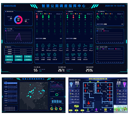 2.系统提供丰富的数据查询页面,能实时查询前端现场大屏当前显示内容(延迟可调节),随时了解厕所使用的状态和各种参数,能查询各种指标的历史数据(男女客流数据、卫生评价数据、空气检测值,蹲位使用情况,以及产品故障等)
